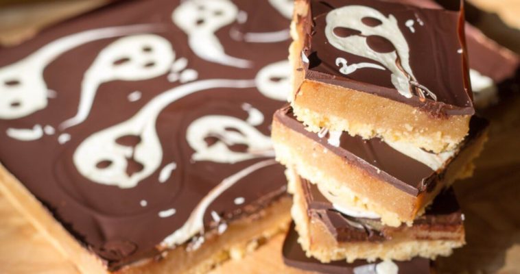 Melt the chocolate in separate bowls over pans of simmering water. Pour the dark chocolate over the caramel and then reserve a tablespoon of dark chocolate in a piping bag. For the ghost bodies, pipe a circle of white chocolate on the melted dark chocolate, drag a skewer from the center of the circle to create a tail. Wipe the skewer between ghosts for the best effect then pipe on some eyes and a mouth.