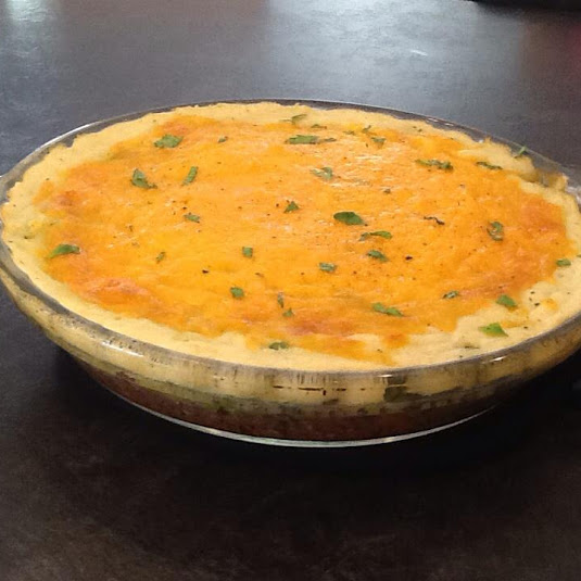 Pour ground meat into a deep pie plate. Top with peas. Spread the whipped potatoes over the top.