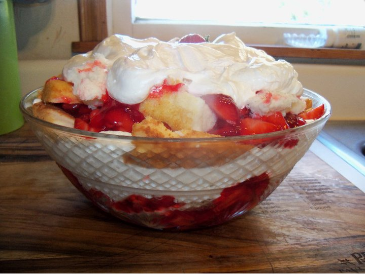In a beautiful serving bowl, place the strawberries at the bottom, add a layer of whipped cream, a layer of the sponge cake slices and repeat the layers.