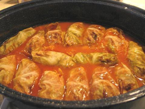 Once cool enough to handle, take one of the cabbage leaves and spoon beef and rice mixture into the center. Fold sides in, roll it up and place it thick rib side down into the roasting pan. Repeat with the rest of the filling and cabbage leaves.