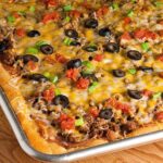 Arrange meat mixture, onion, and mushrooms over batter.