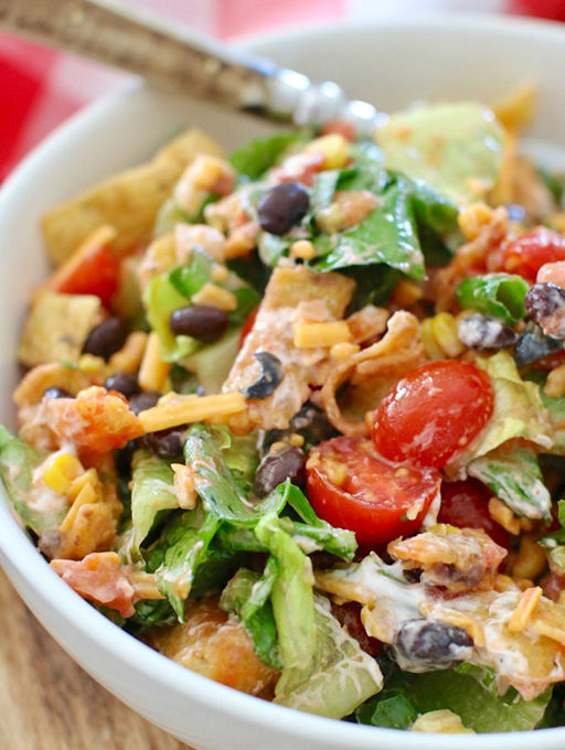 In a large salad bowl, add chopped lettuce, BUSH’S® Organic Black Beans, tomato, cheese, and olives.