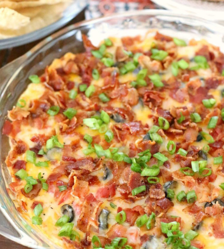 At this point, you can dig in with some tortilla chips or bake in a preheated oven for about 10-15 minutes until warmed through and cheese is melted.