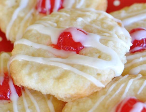 Cut maraschino cherries into quarters and place one piece in the middle of each cookie, alternating with red and green cherries.