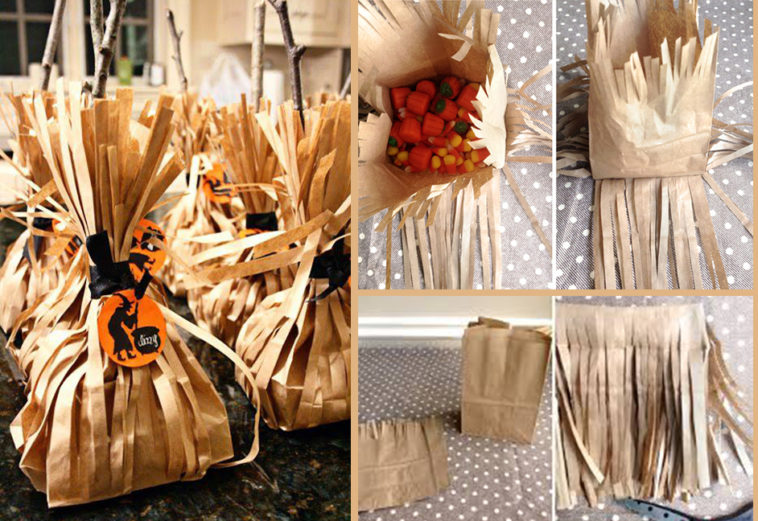 You need two lunch-size paper bags for each broomstick. Unfold one bag, and push out its base while folding in the left and right sides.