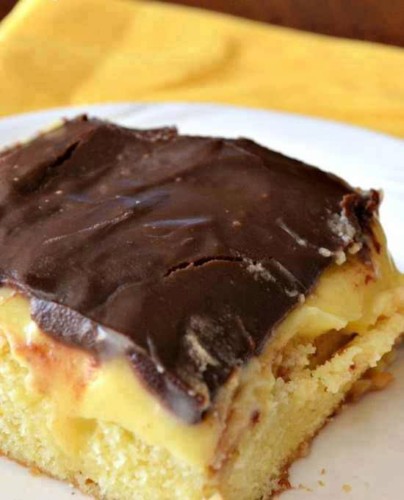 Pour the pudding on top of the cake and into the holes of the cake. I gently tapped the baking dish on the counter to help the pudding get down into the holes. If the pudding sits a few minutes and becomes thick, it will not get down into the holes. If this happens, just add 1 to 4 tablespoons of milk and stir to thin it out.